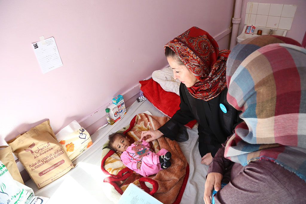 UNICEF representative in Yemen Meritxell Relaño checks on a boy suffering from malnutrition at Al-Sabeen Hospital, Sana’a, Yemen. Credit: UNICEF